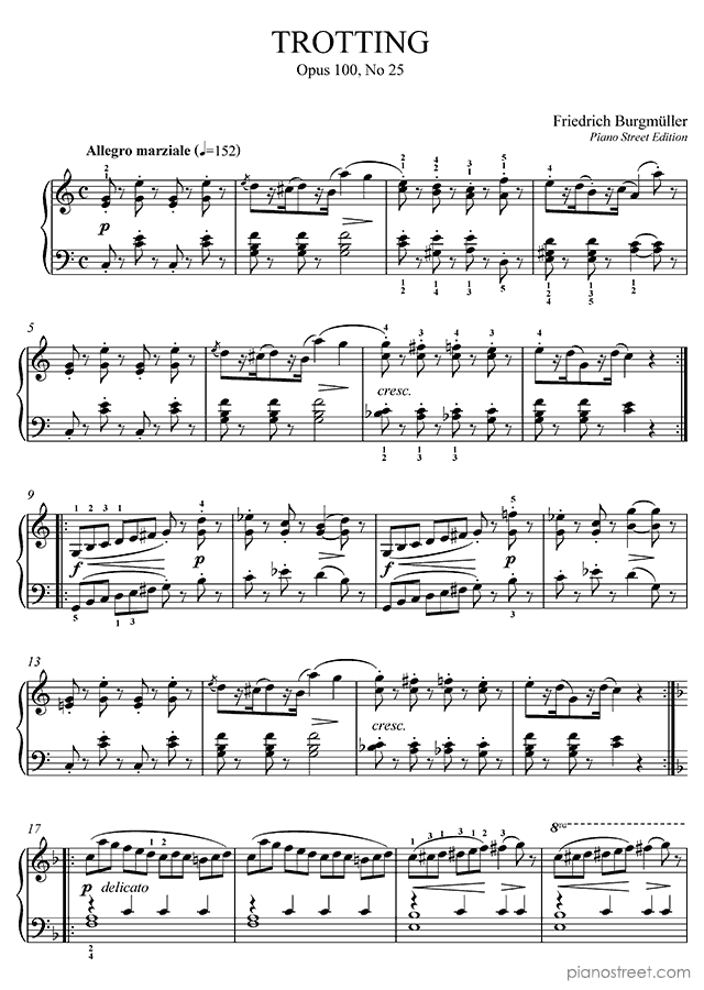 This piece is composed by Friedrich BurgmüllerIt was written during the Early Romantic period. Title: Trotting, Op. 100 No. 25 in C Major from 25 Easy and Progressive Studies. The difficulty level if graded by ABRSM would be approximately 5 and it belongs to the Early Romantic period.