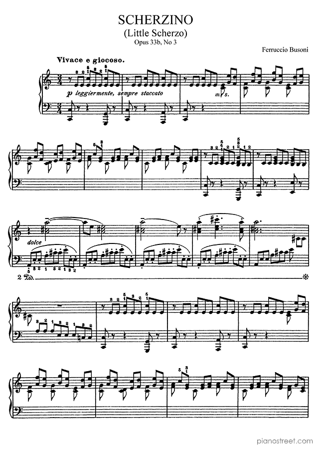 Scherzino in C Major Op. 33 No. 3 by Ferruccio Busoni. Sheet music and recordings of thousands of piano pieces by Ferruccio Busoni and many other composers to view in digital devices, print or listen to.