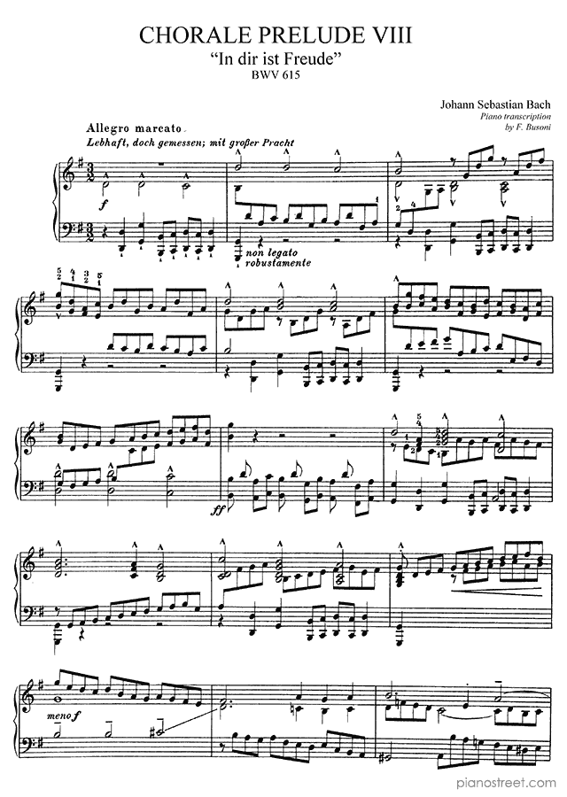Baroque piano sheet music by Ferruccio Busoni to download and print instantly: Bach: Chorale Prelude (BWV 615) No. 8 in the key of . Level 8+, composition type: Transcription (published in 1909)