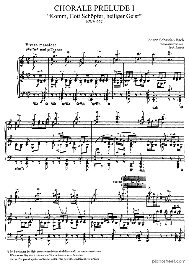 Ferruccio Busoni: Bach: Chorale Prelude (BWV 667) No. 1 in C Major from Transcriptions - piano sheet music to print instantly. This piece is level 8+ and was composed during the Baroque period.