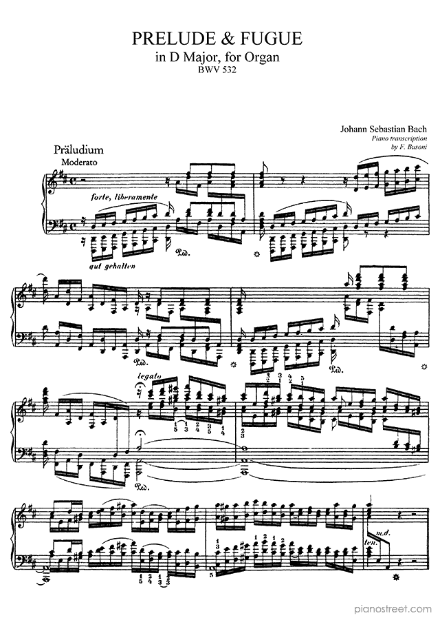 DOWNLOAD Bach: Prelude & Fugue for Organ (BWV 532) in D Major by Ferruccio Busoni (published in 1888) . High quality classical piano scores from the Piano Street sheet music library.