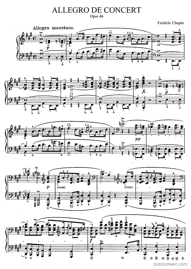 DOWNLOAD Allegro de Concert in A Major Op. 46 by Frédéric Chopin (published in 1841) . High quality classical piano scores from the Piano Street sheet music library.