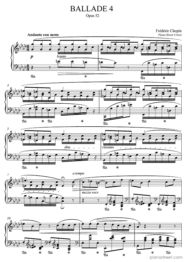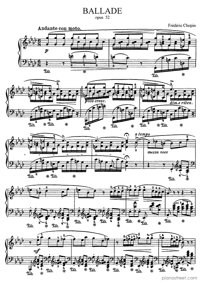 Ballade 4 in F Minor - Op. 52 is a piano piece by the early romantic composer Frédéric Chopin who lived between the years 1810 and 1849.