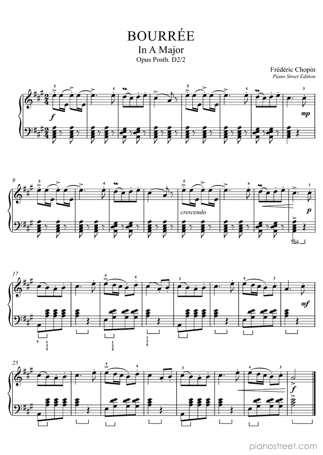 Bourrée No. 2 in A Major - is a piano piece by the early romantic composer Frédéric Chopin who lived between the years 1810 and 1849.