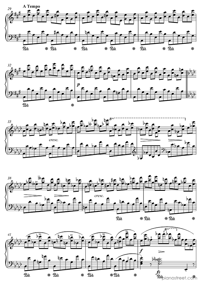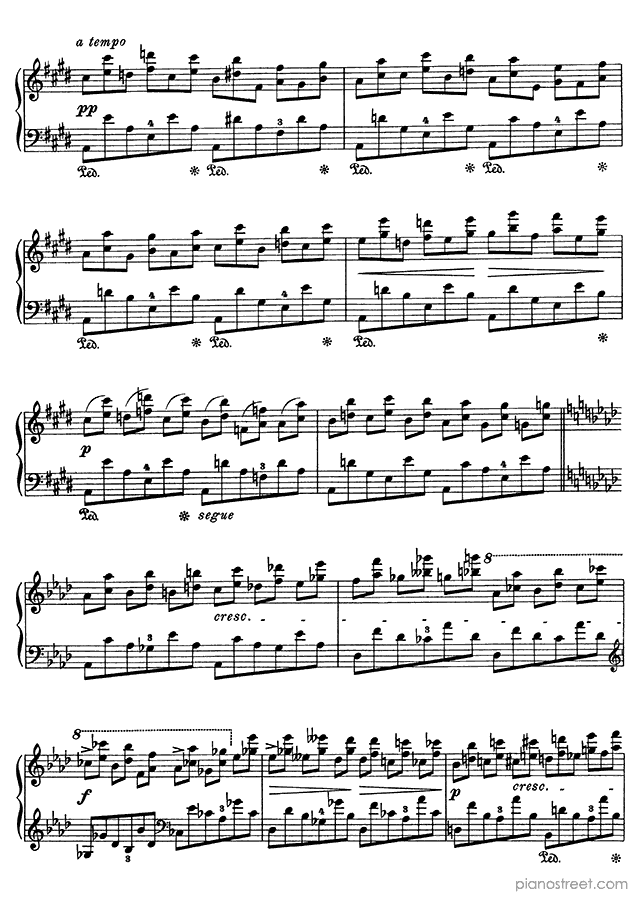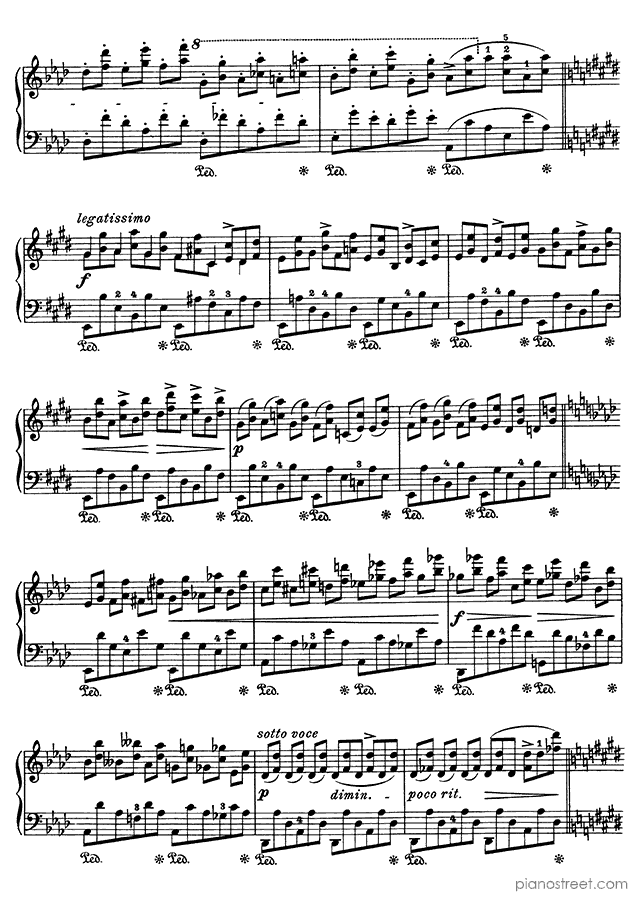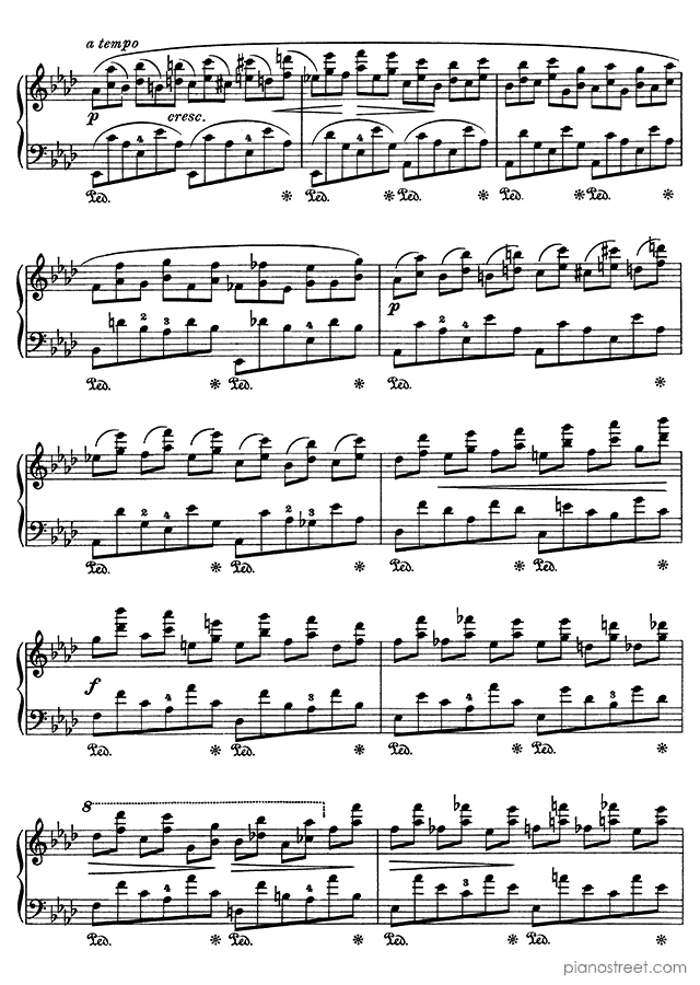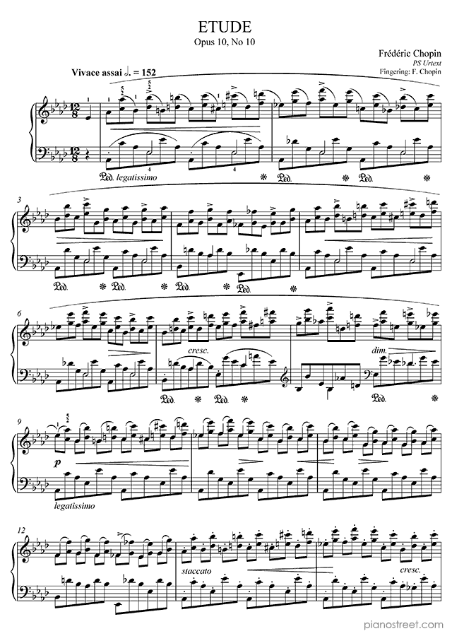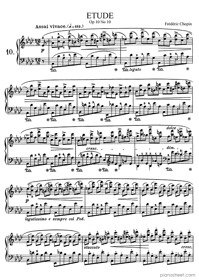 Frédéric Chopin, one of the prominent composers active in the Early Romantic era, has written this piece titled Etude Op. 10 No. 10 in A-flat Major from Etudes. The composition is categorized as "Study" in Piano Street's sheet music library and the level of difficulty is 8+.