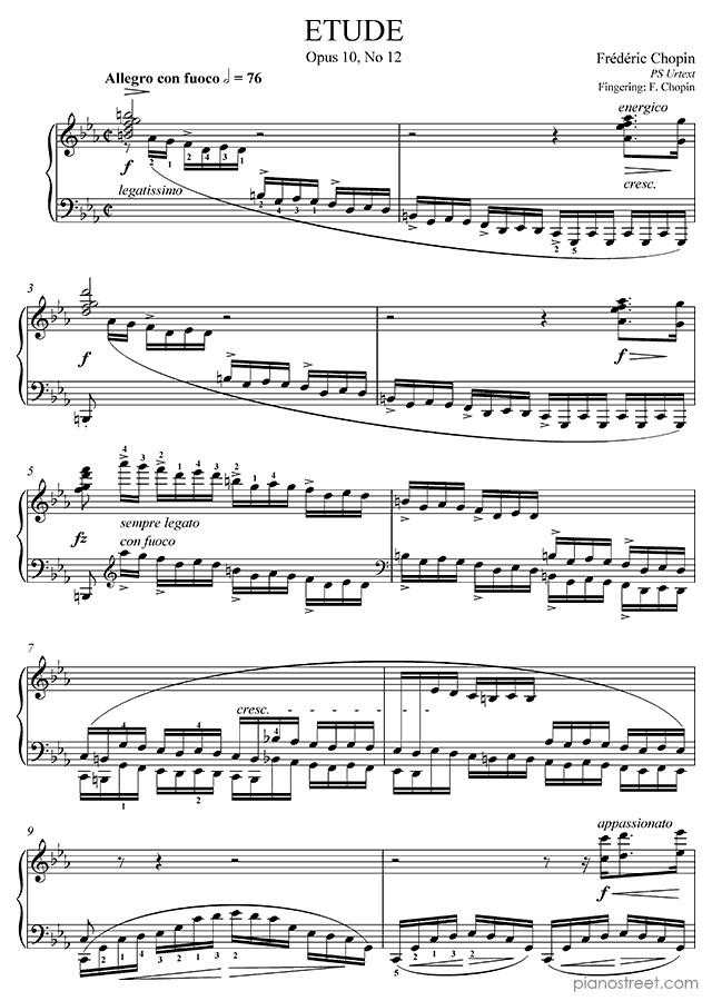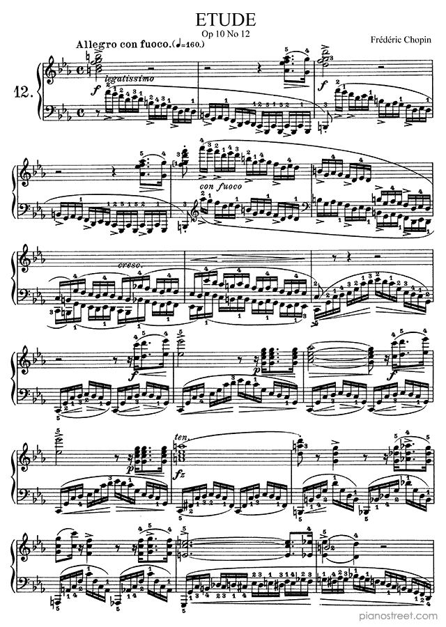 Etude Op. 10 No. 12 in C Minor, a composition by the early romantic composer Frédéric Chopin who was born in 1810 and died in 1849. The piano score of this piece was first published in 1832 and is part of Chopin's Etudes.
