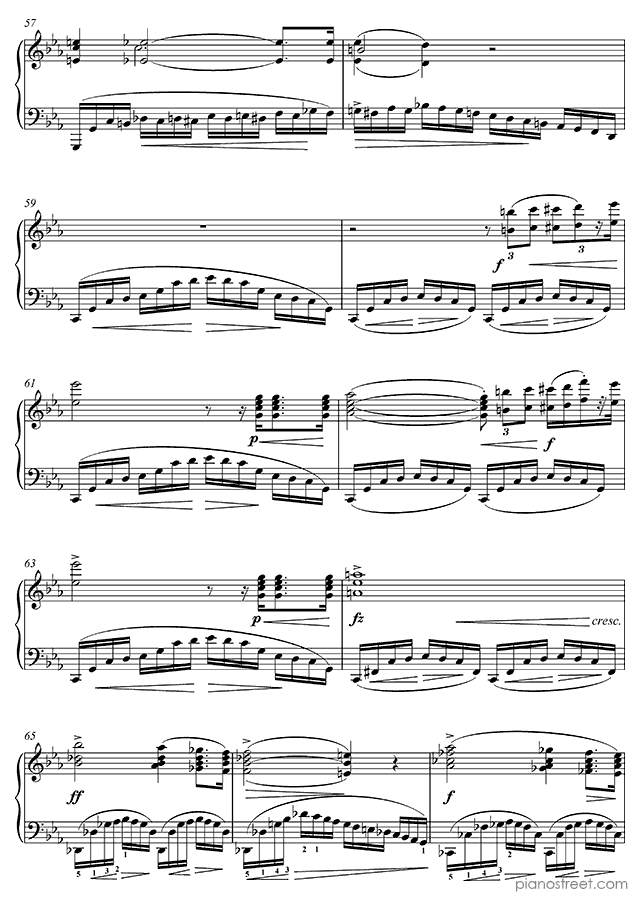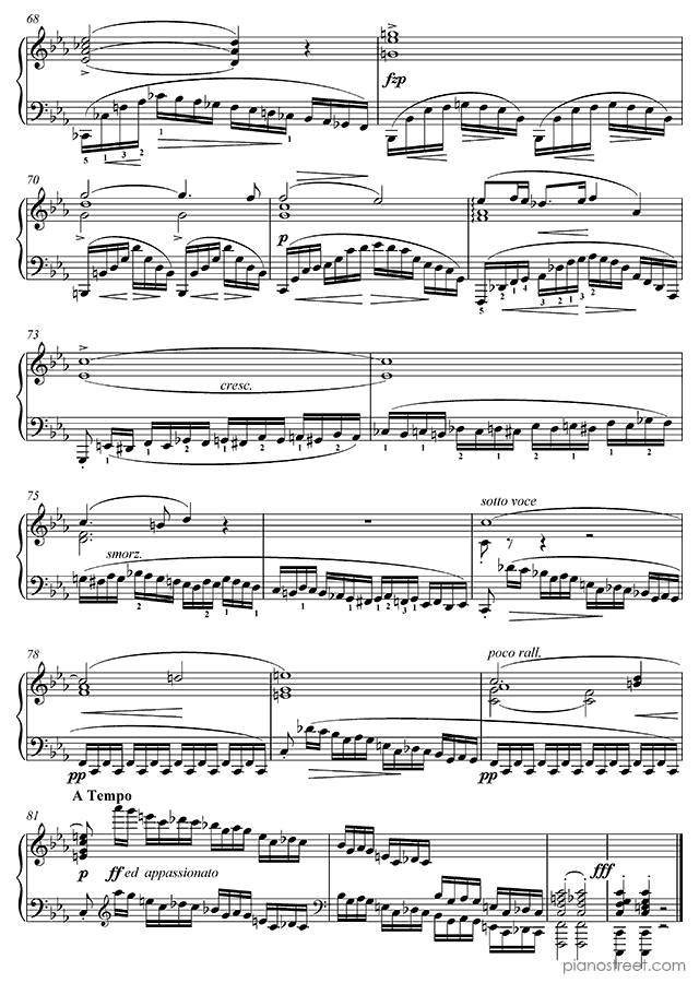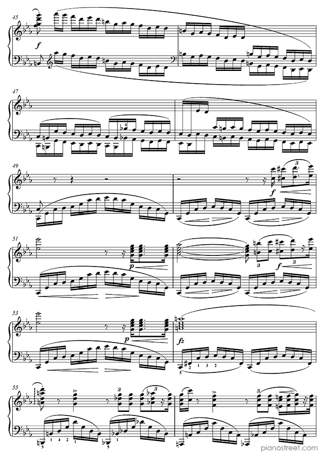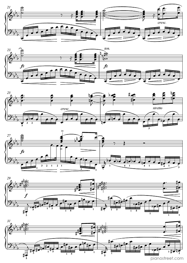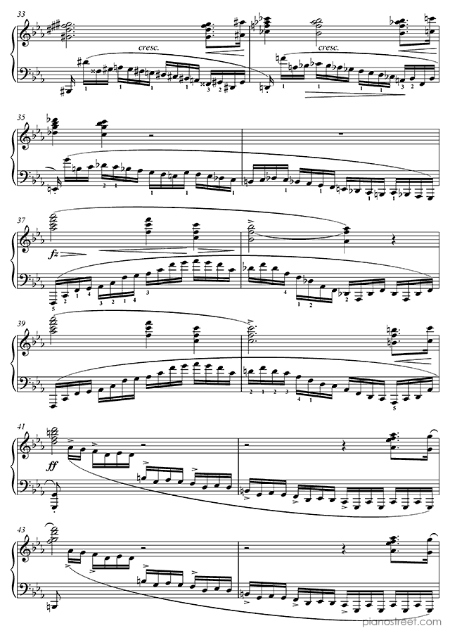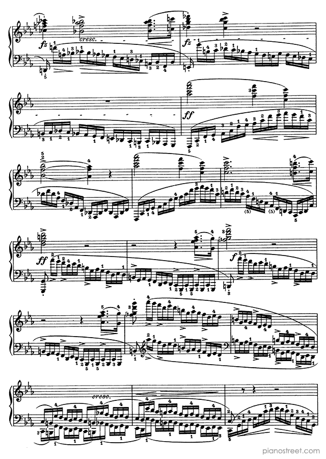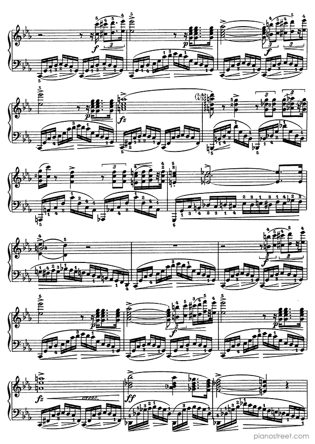 Like the rest of Chopin’s Etudes, the Revolutionary presents serious technical hurdles, but unlike most of the others, the difficulties are mainly in the left hand. A heroic, fanfare-like melody is played by the right hand while the left hand creates an impression of chaos and intensity by making continuous fast runs up and down the keyboard. One of the more interesting aspects of the piece is its abrupt ending. It ends with a descending sweep in both hands that arrives at a C major chord, supposedly brighter and more positive-sounding than the rest of the piece, which is in c minor. However, the arrival of this chord is so abrupt that the effect is anything but soothing. An unexpected touch to one of Chopin's most intense works, and possibly an allusion to the end of the first movement of Beethoven’s Sonata op 111, which Chopin is known to have admired.Background