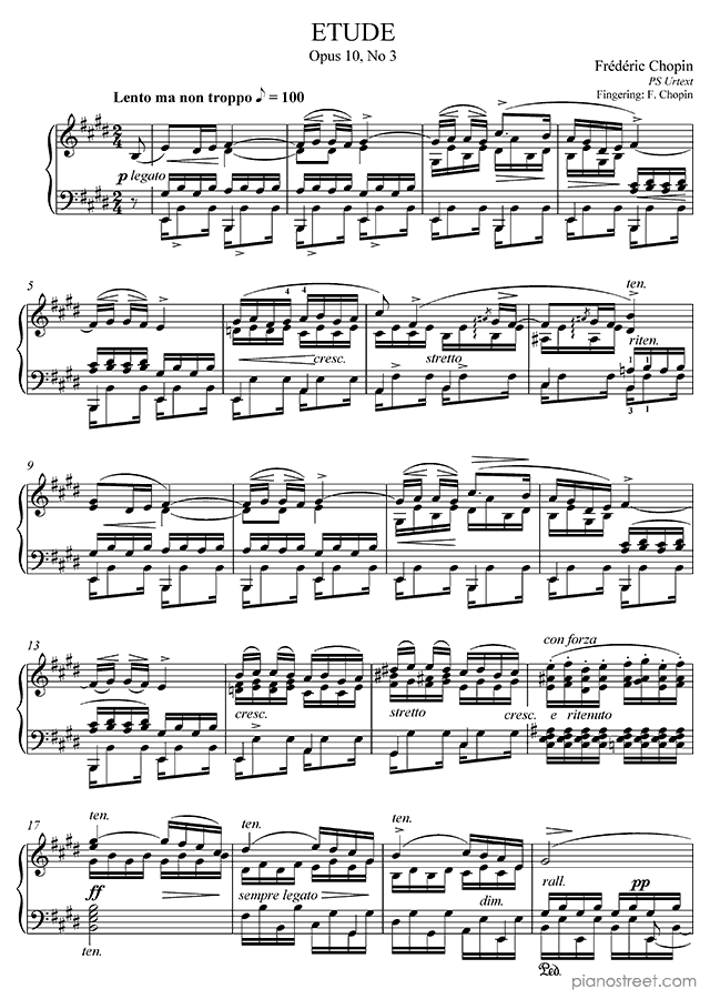 Chopin called the theme of the Etude, Op. 10, No. 3 to be the most beautiful he ever composed. The piece is charming and simple, lacking the fiery pyrotechnics of the other etudes. It is somewhat similar in scope, style and atmosphere to the second movement of Beethoven’s Pathétique Sonata. Others have called the piece "Tristesse", but rather than just “sadness” it seems to express a kind of warm nostalgia and love for the homeland.Background