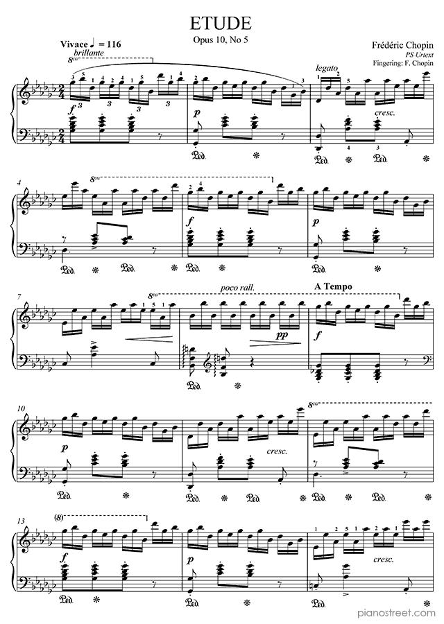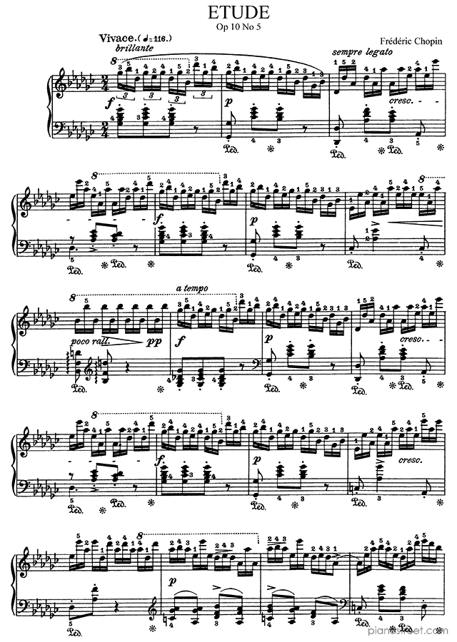 This piece is composed by Frédéric Chopin and was published in 1832. Title: Etude, Op. 10 No. 5 in G-flat Major from Etudes. The difficulty level if graded by ABRSM would be approximately 8+ and it belongs to the Early Romantic period.