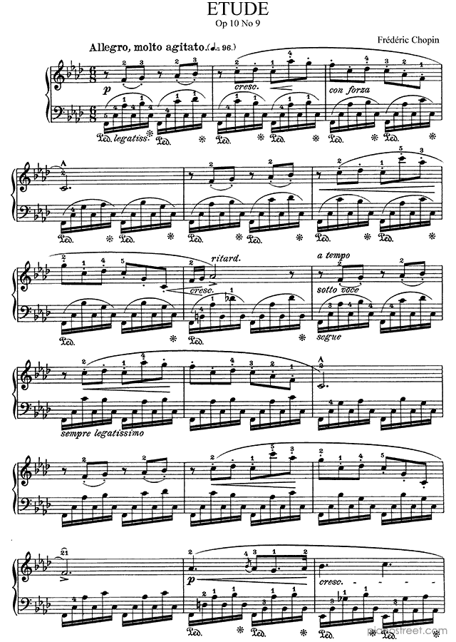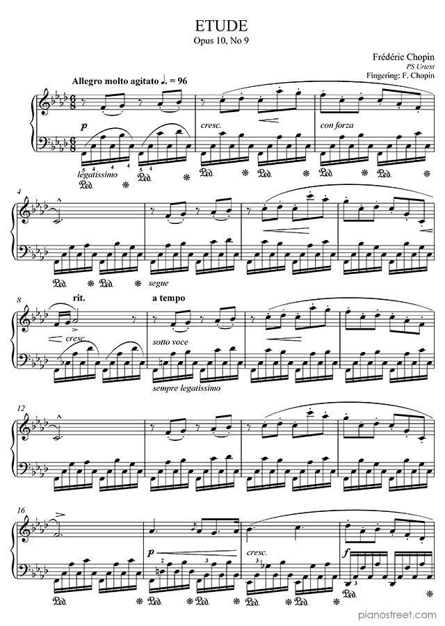 Frédéric Chopin, who was one of the prominent composers active in the Early Romantic era, wrote this piece titled "Etude"Op. 10 No. 9 in F Minor from Etudes. The composition is categorized as "Study" in the sheet music library and the level of difficulty in the piano music database is 8+.