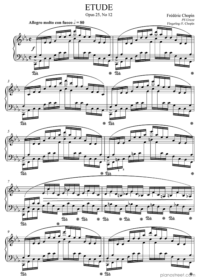 Etude Op. 25 No. 12 in C Minor, by the early romantic composer Frédéric Chopin. This piano piece was initially published in the year 1836 and is included in Etudes by Chopin.