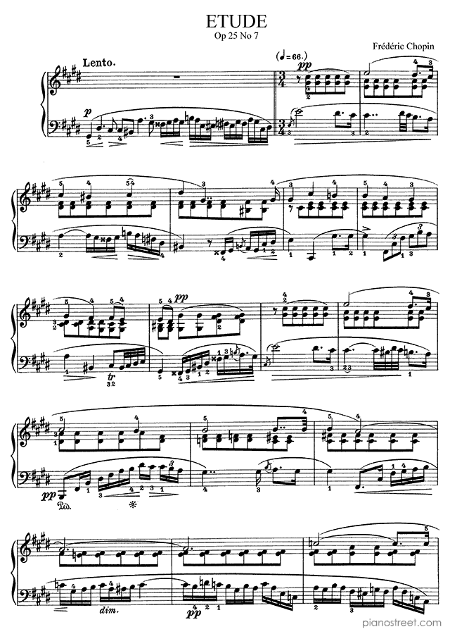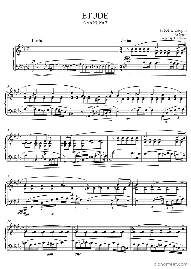 Frédéric Chopin, who was one of the prominent composers active in the Early Romantic era, wrote this piece titled "Etude"Op. 25 No. 7 in C-sharp Minor from Etudes. The composition is categorized as "Study" in the sheet music library and the level of difficulty in the piano music database is 8.