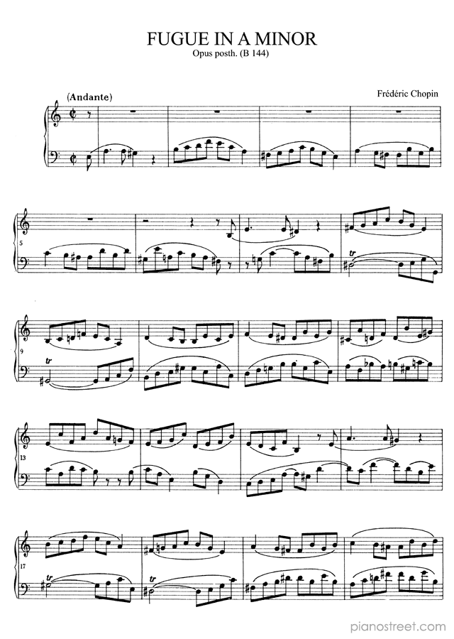 Fugue in A Minor - B. 144 is a piano piece by the early romantic composer Frédéric Chopin who lived between the years 1810 and 1849.