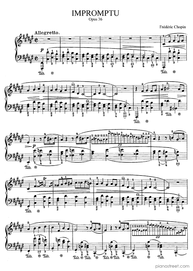 Piano sheet music and recordings. This piece is from Impromptus by Frédéric Chopin: Impromptu Op. 36 in F-sharp Major (published in 1839) . Level 8+, Period: Early Romantic