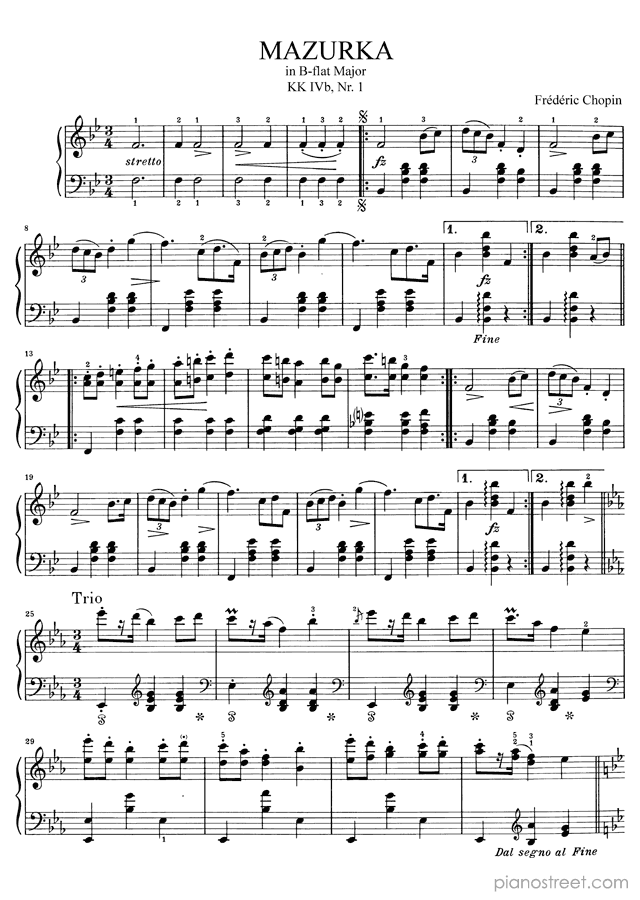 Chopin: Mazurka KK IVb:1 Op. posth. in B-flat Major (published in 1832) . DOWNLOAD piano sheet music from Piano Street digital sheet music library.