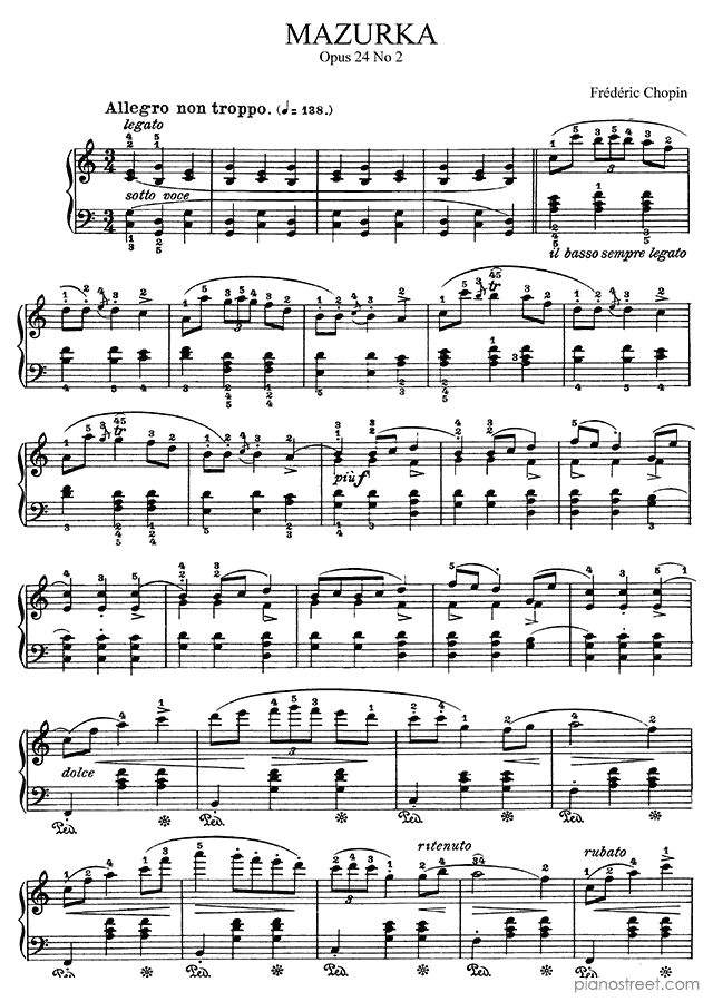 Piano sheet music and recordings. This piece is from Mazurkas by Frédéric Chopin: Mazurka Op. 24 No. 2 in A Minor . Level 7, Period: Early Romantic