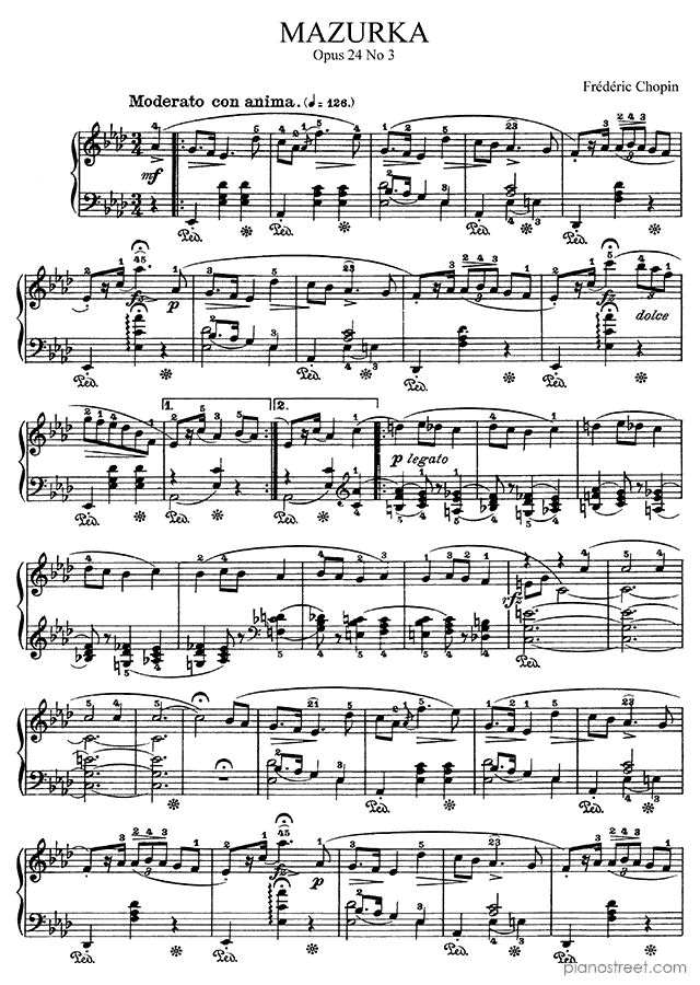 Frédéric Chopin: Mazurka Op. 24 No. 3 in A-flat Major from Mazurkas - piano sheet music to print instantly. This piece is level 7 and was composed during the Early Romantic period.