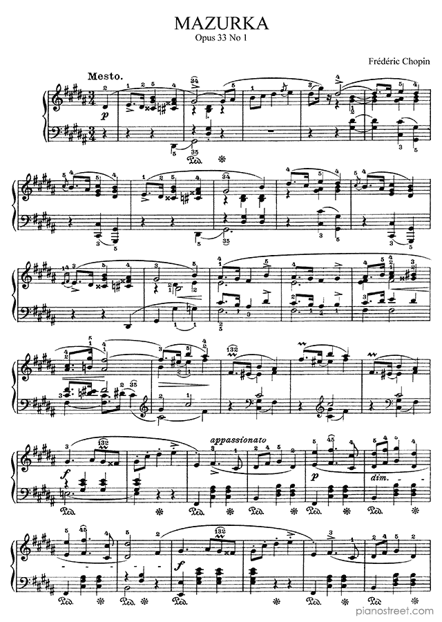 Downloadable piano sheet music from Mazurkas by Frédéric Chopin to print: Mazurka Op. 33 No. 1 in G-sharp Minor
