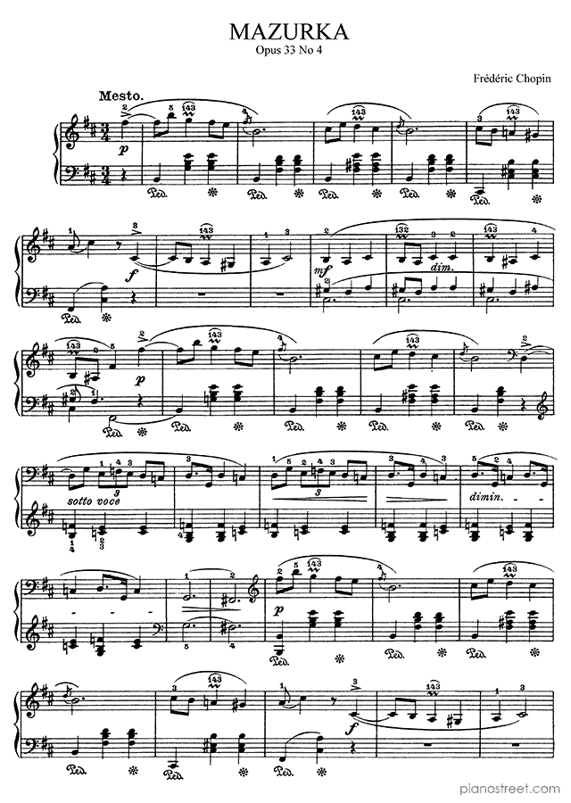 Mazurka Op. 33 No. 4 in B Minor, by the early romantic composer Frédéric Chopin. It was written during the Early Romantic period and is included in Mazurkas by Chopin.