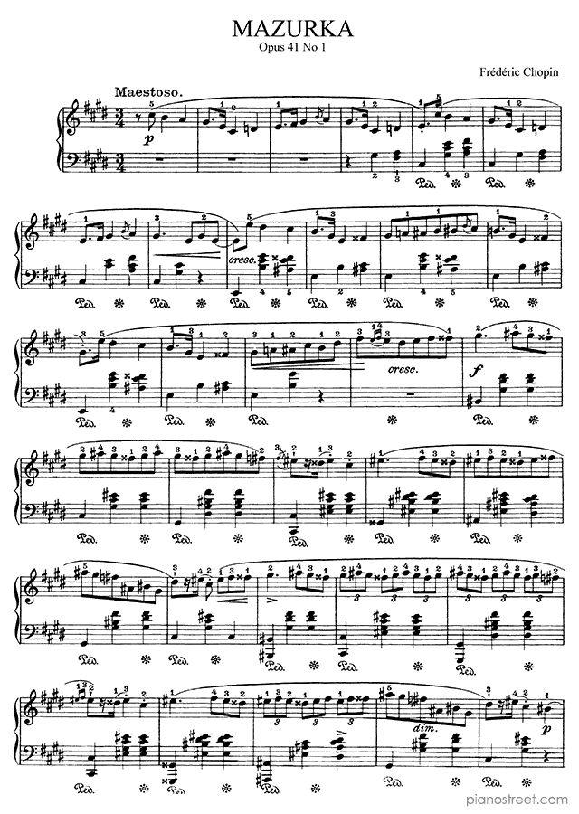 Frédéric Chopin: Mazurka Op. 41 No. 1 in C-sharp Minor from Mazurkas - piano sheet music to print instantly. This piece is level 7 and was composed during the Early Romantic period.