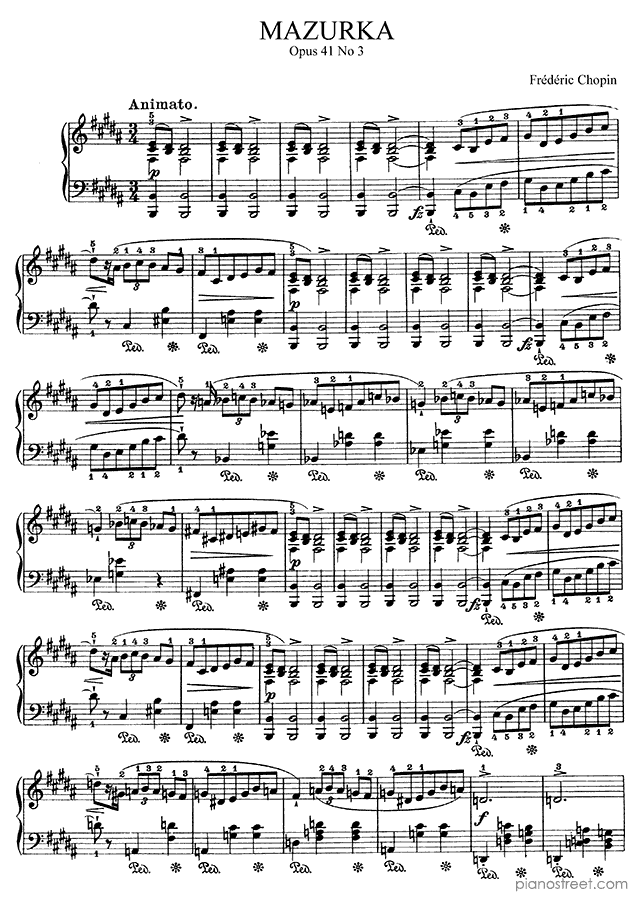 Mazurka in B Major Op. 41 No. 3 by Frédéric Chopin. Sheet music and recordings of thousands of piano pieces by Frédéric Chopin and many other famous composers to view in your digital device, print out or listen to.