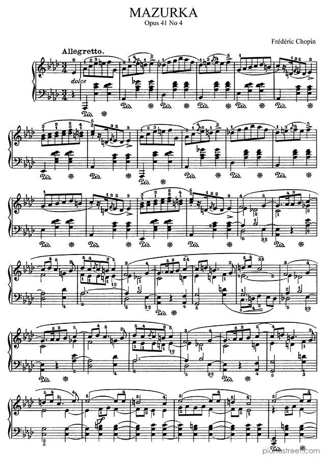 Mazurka in A-flat Major - Op. 41 No. 4 is a piano piece by the early romantic composer Frédéric Chopin who lived between the years 1810 and 1849.