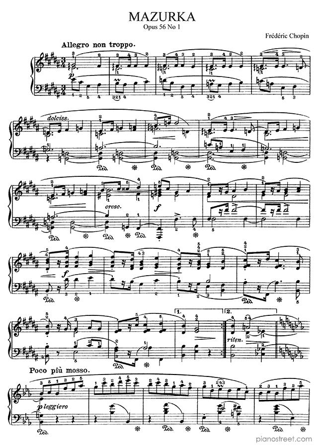 Classical piano sheet music by Chopin to download: Mazurka Op. 56 No. 1 in the key of This piece has difficulty level 7 in the category Piece