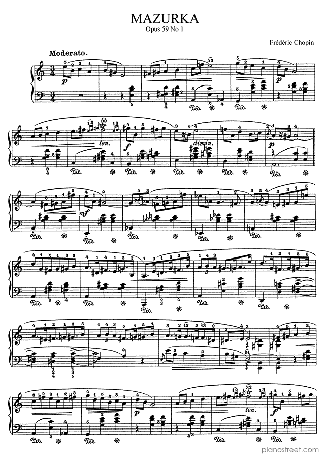 Frédéric Chopin: Mazurka Op. 59 No. 1 in A Minor from Mazurkas - piano sheet music to print instantly. This piece is level 7 and was composed during the Early Romantic period.