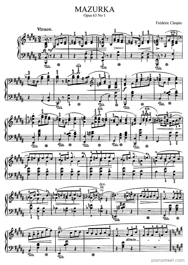 Mazurka in B Major - Op. 63 No. 1 is a piano piece by the early romantic composer Frédéric Chopin who lived between the years 1810 and 1849.