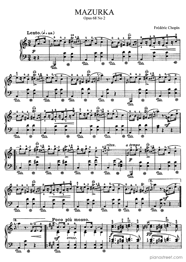 Frédéric Chopin: Mazurka Op. 68 No. 2 in A Minor from Mazurkas - piano sheet music to print instantly. This piece is level 7 and was composed during the Early Romantic period.