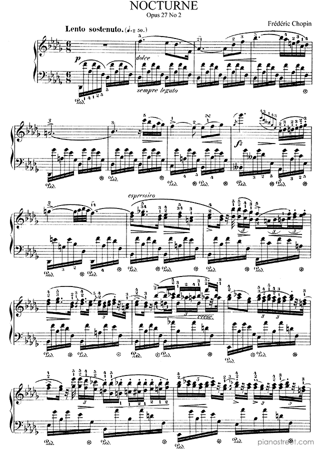 Nocturne Op. 27 No. 2 in D-flat Major, a composition by the early romantic composer Frédéric Chopin who was born in 1810 and died in 1849. The piano score of this piece was first published in 1836 and is part of Chopin's Nocturnes.