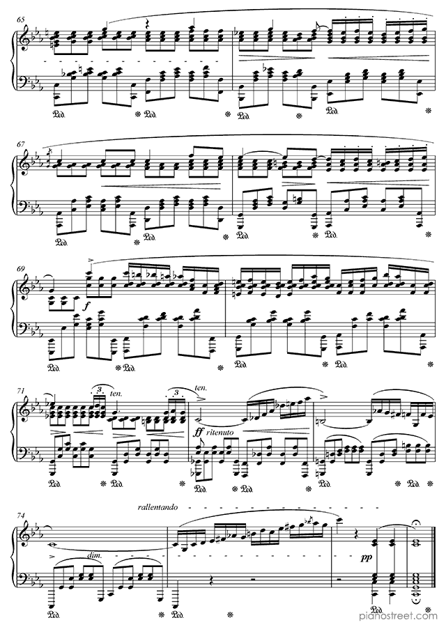 The famous Nocturne in c minor Op. 48 no. 1 is perhaps the grandest in scope of all the Nocturnes. More akin to a Ballade in miniature than a Nocturne, it builds its narrative on three main episodes. Beginning in a mood of profound tragedy, it presents a lonely cantilena, marked mezza voce, over a slow, funereal accompaniment. The second episode features a new theme in C major, built on consoling, chorale-like chords. The chords expand and become arpeggiated, and rising octaves interject with increasing insistence, building to a powerful climax. In the final episode, the opening material returns in a passionate re-exposition, now marked doppio movimento (twice as fast) and underlined by rapidly repeating chords. The piece ends with a diminuendo, finally stopping on three muffled chords, like the tolling of a distant bell.
