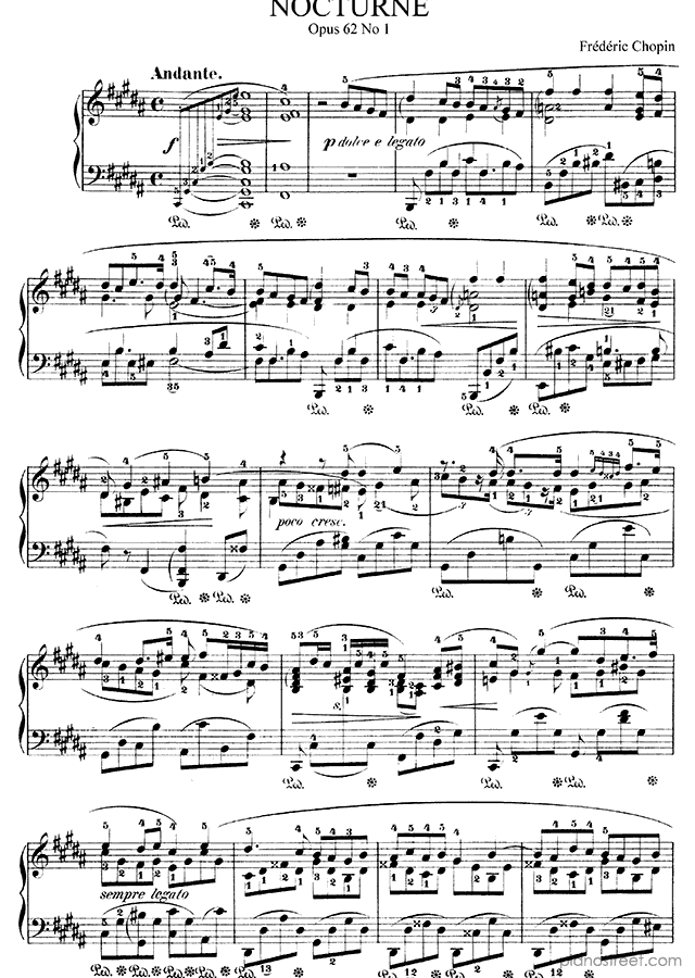 The Nocturne in B major Op. 62 no. 1 stands out by how firmly it stays in the realm of the subtle, hiding its mysteries behind a meticulously written, almost reserved surface. Eschewing, for the most part, the lone melodic line over a rolling accompaniment typical of the genre, it supports its main theme with a web of counterpoint from the outset. The mood remains intimate throughout, the narrative weaving in and out of a gentle calm and softspoken melancholia, save for one outburst – a d sharp minor scale running up and down the length of the piano’s upper register, a cry of despair quelled as suddenly as it appears. When the contrasting middle section arrives, the music remains gentle, changing only to a single voice over a syncopated accompaniment and via a slight modification of emotional character. The return of the opening theme is famed for how it is embellished with figurations and multiple-bar-long trills and has been likened to an Italian da capo aria in the bel canto style, a genre Chopin is known to have loved.Background