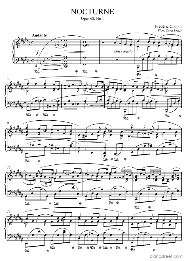 Nocturne Op. 62 No. 1 in B Major, a composition by the early romantic composer Frédéric Chopin. The piano score of this piece was first published in 1846 and is part of Nocturnes by Chopin.