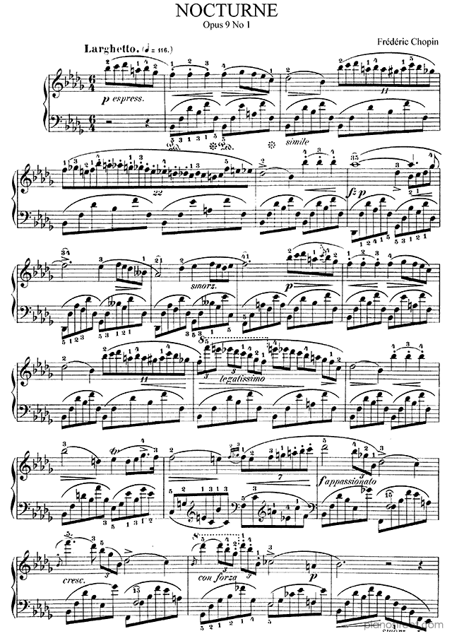 The three nocturnes that comprise the Op. 9 set are among the most popular of all of Chopin’s works. No. 2, especially, is famous, but No. 1 is almost as well-known. It gently rocks listeners as if they were in an old-fashioned wooden crib. Chopin juxtaposes uneven collections of notes against the nearly rigid evenness of the eighth notes in the left hand. The second section takes us into a strange other world: an almost ascetic melody without ornaments, repeating the same phrases over and over again. This takes up a full two-thirds of the piece; by contrast, the two “A sections” are pretty tiny. This is another piece of Chopin’s in the minor that resolves into a major – "Picardy" – third at the end (like for instance the "Revolutionary Etude", and the Nocturne No. 20 in C-sharp minor).Background