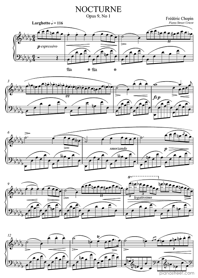 This piece is composed by Frédéric Chopin and was published in 1833. Title: Nocturne, Op. 9 No. 1 in B-flat Minor from Nocturnes. The difficulty level if graded by ABRSM would be approximately 8 and it belongs to the Early Romantic period.