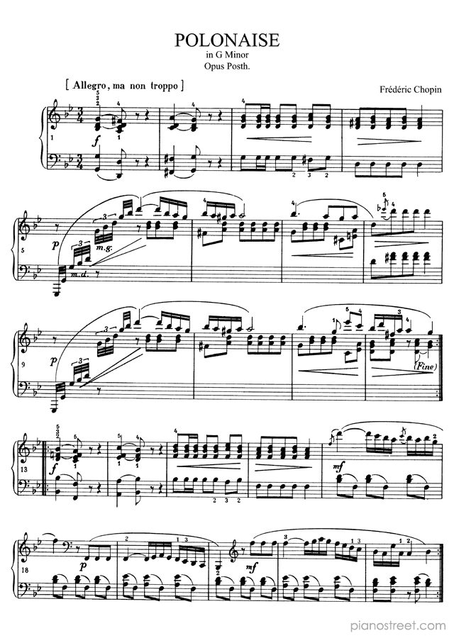 Frédéric Chopin: Polonaise Op. posth. in G Minor from Polonaises - piano sheet music to print instantly. This piece is level 5 and was composed during the Early Romantic period.