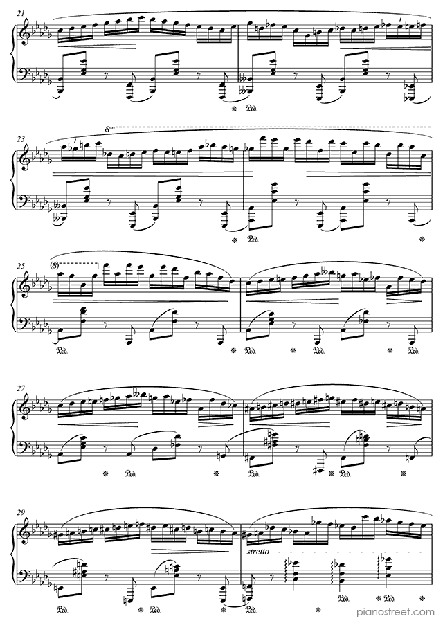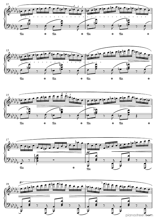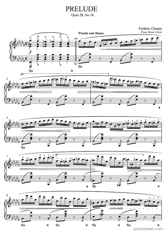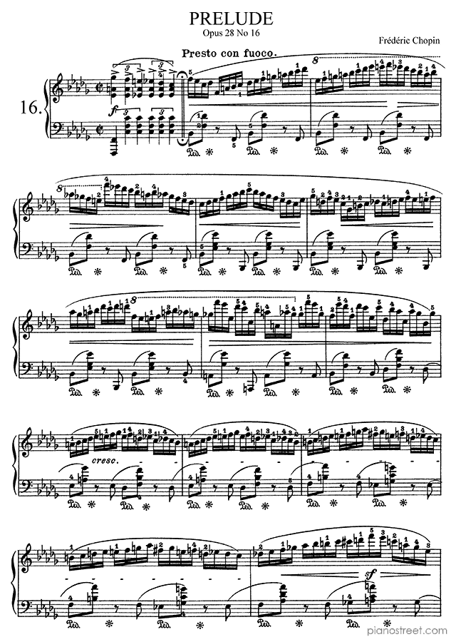 Frédéric Chopin, one of the prominent composers active in the Early Romantic era, has written this piece titled Prelude Op. 28 No. 16 in B-flat Minor from Preludes. The composition is categorized as "Piece" in Piano Street's sheet music library and the level of difficulty is 8+.