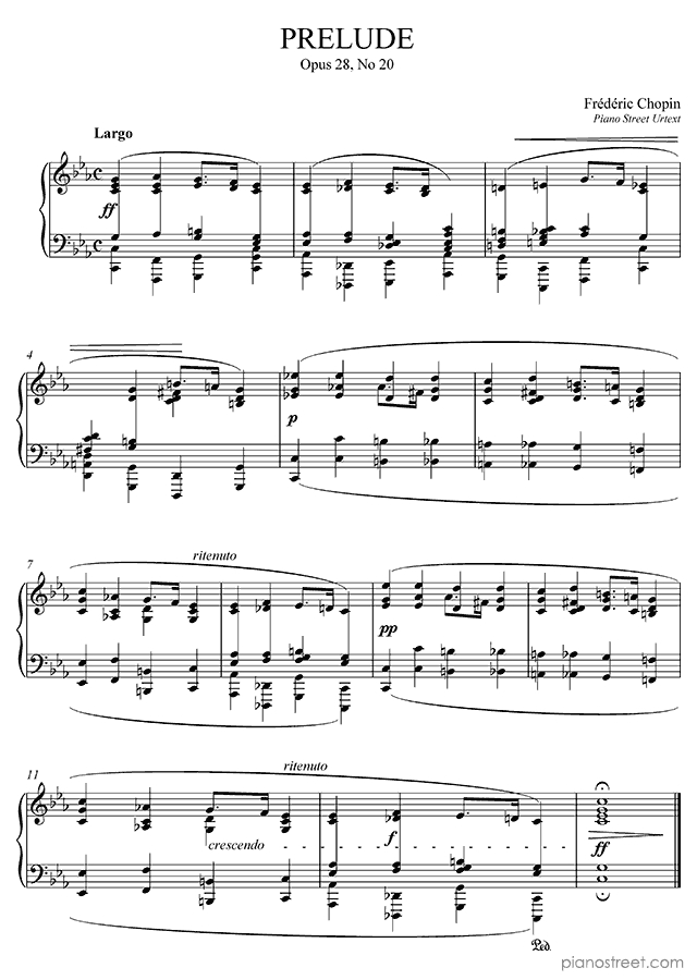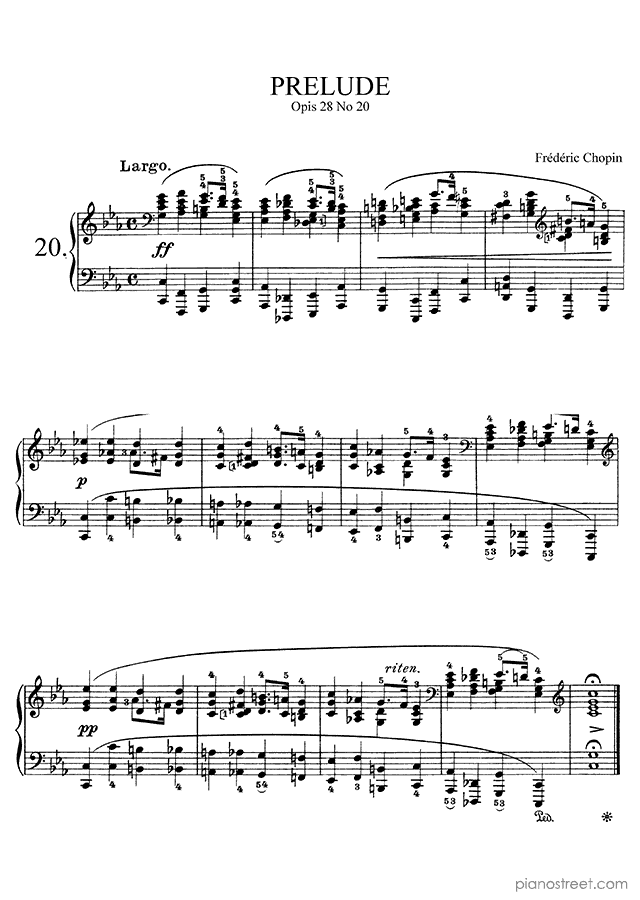 Prelude Op. 28 No. 20 in C Minor, by the early romantic composer Frédéric Chopin. This piano piece was initially published in the year 1834 and is included in Preludes by Chopin.