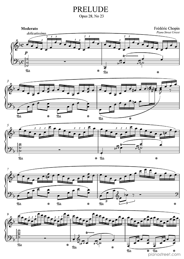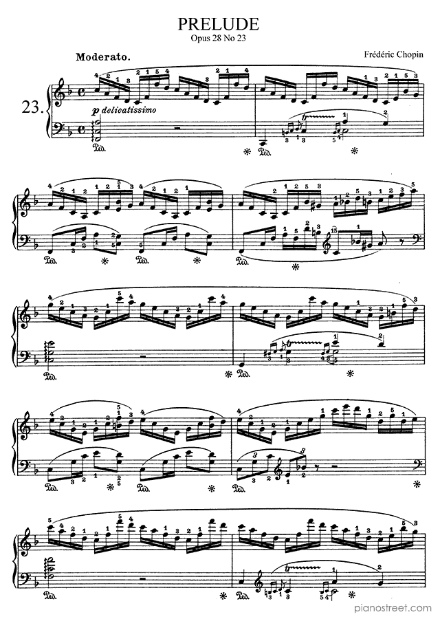 Prelude in F Major Op. 28 No. 23 by Frédéric Chopin. Sheet music and recordings of thousands of piano pieces by Frédéric Chopin and many other famous composers to view in your digital device, print out or listen to.