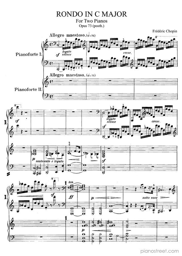 Rondo - for Two Pianos in C Major Op. 73 by Frédéric Chopin. Sheet music and recordings of thousands of piano pieces by Frédéric Chopin and many other famous composers to view in your digital device, print out or listen to.