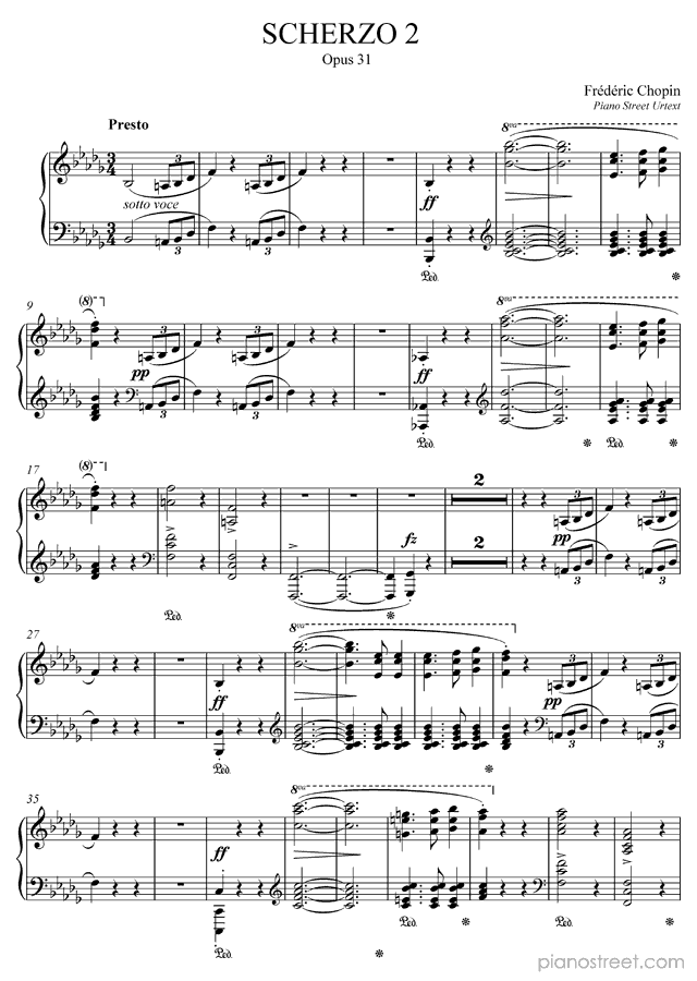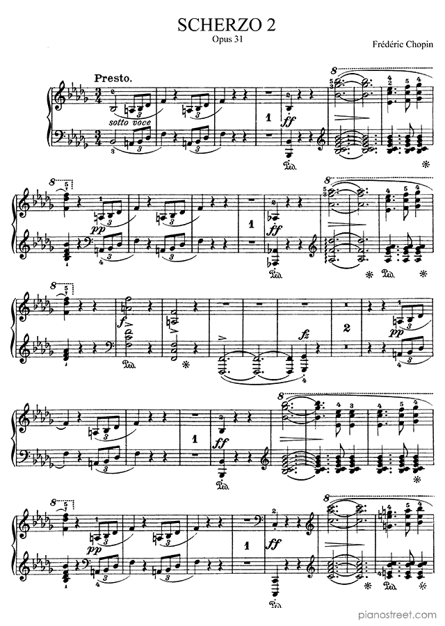 Scherzo 2 Op. 31 in B-flat Minor, a composition by the early romantic composer Frédéric Chopin who was born in 1810 and died in 1849. It was composed during the Early Romantic period and is part of Chopin's Scherzi.
