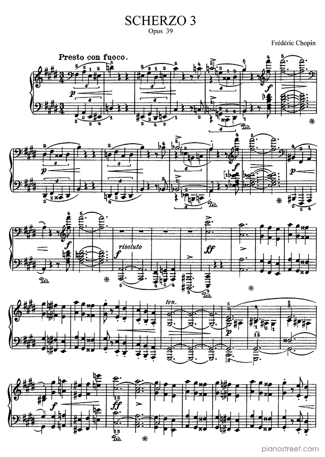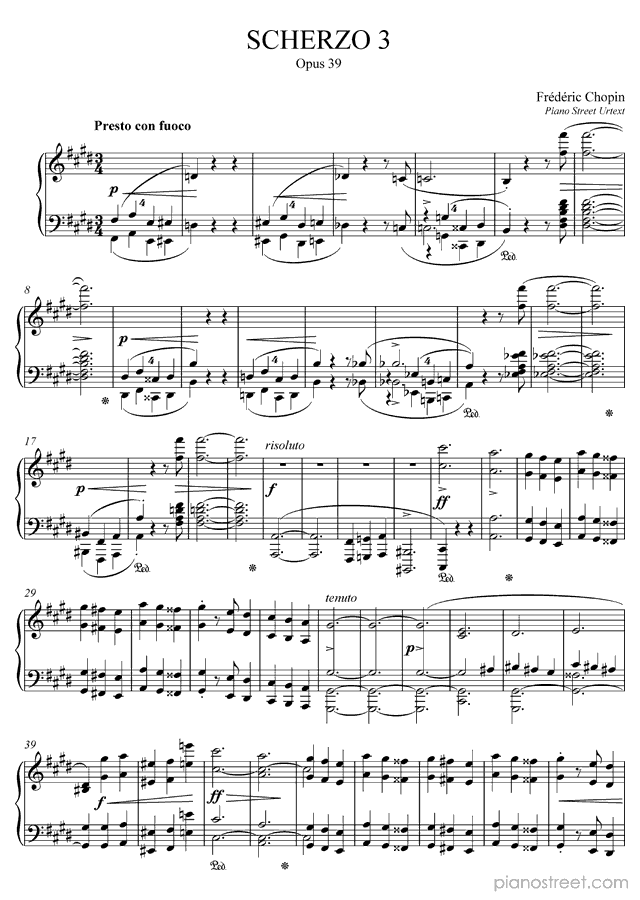Scherzo 3 Op. 39 in C-sharp Minor, by the early romantic composer Frédéric Chopin. It was written during the Early Romantic period and is included in Scherzi by Chopin.