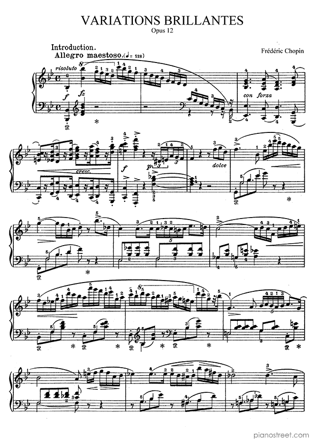 Frédéric Chopin: Variations Brillantes Op. 12 in B-flat Major - piano sheet music to print instantly. This piece is level 8+ and was composed during the Early Romantic period.