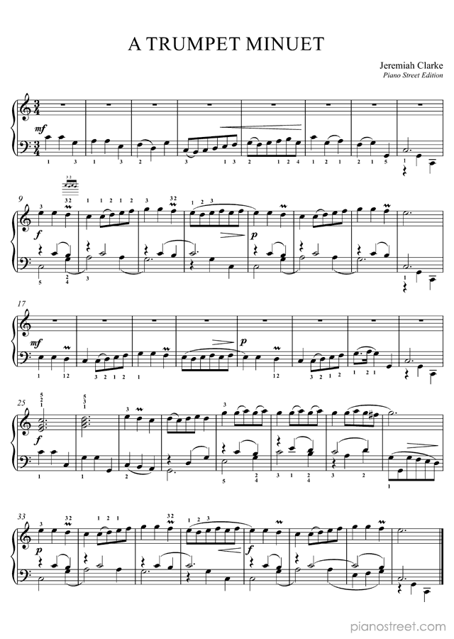 A Trumpet minuet in C Major, a composition by the baroque composer Jeremiah Clarke who was born in 1674 and died in 1707. It was composed during the Baroque period and is part of Clarke's Miscellaneous pieces.