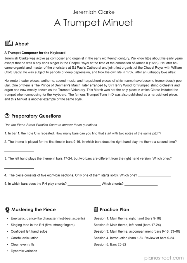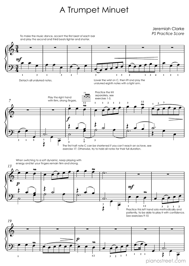 Classical piano sheet music by Clarke to download: A Trumpet minuet in the key of This piece has difficulty level 2 in the category Piece