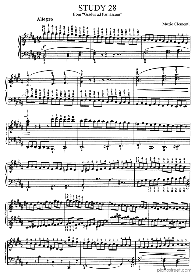 This piece is composed by Muzio Clementi and was published in 1817. Title: Study, No. 28 in B Major from Gradus ad Parnassum. The difficulty level is around ABRSM grade 8 and it belongs to the Classical period.