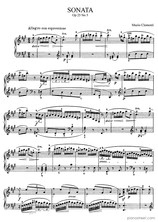 Classical piano sheet music by Muzio Clementi to download and print instantly: Sonata Op. 25 No. 5 in the key of . Level 8, compositional type: Sonata (published in 1790)