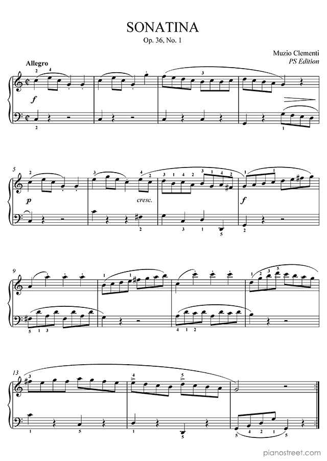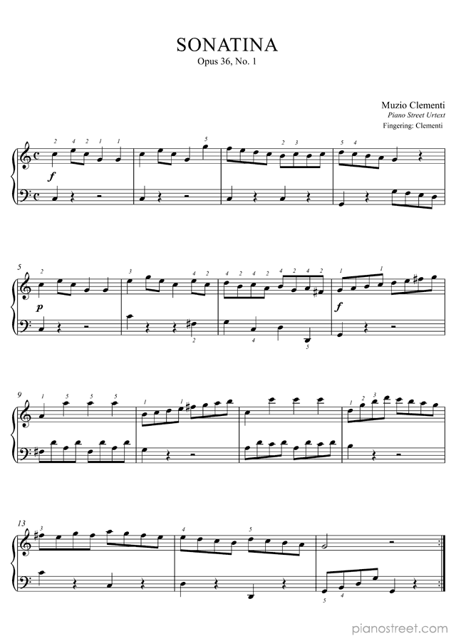 Muzio Clementi wrote over a hundred Sonatas and Sonatinas, of which the opus 36 set, first published in 1797, was by far the most successful - Op. 36 No. 1 especially is known worldwide to virtually every pianist who has advanced to an intermediate level.Around 1815 Clementi issued a Fifth Edition in which several details (notes, dynamics, tempos, articulations etc) were altered. Many passages were transposed up one octave to exploit the greater range of the evolving piano. However, most current editions are still based on the musical text of the first edition.