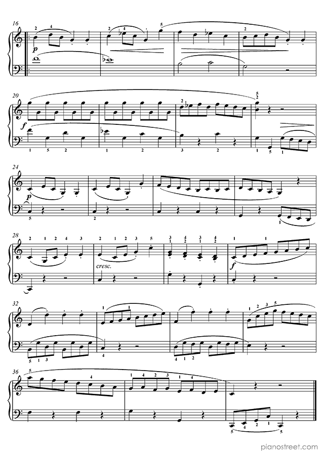The second theme is in the dominant (G Major). Make sure that you play the G Major scale in m. 8 and m. 10 with the correct fingering. Notice that the notes in this second theme form ascending lines. When playing these lines, be... Sign up for a Gold membership to read the practice tips.